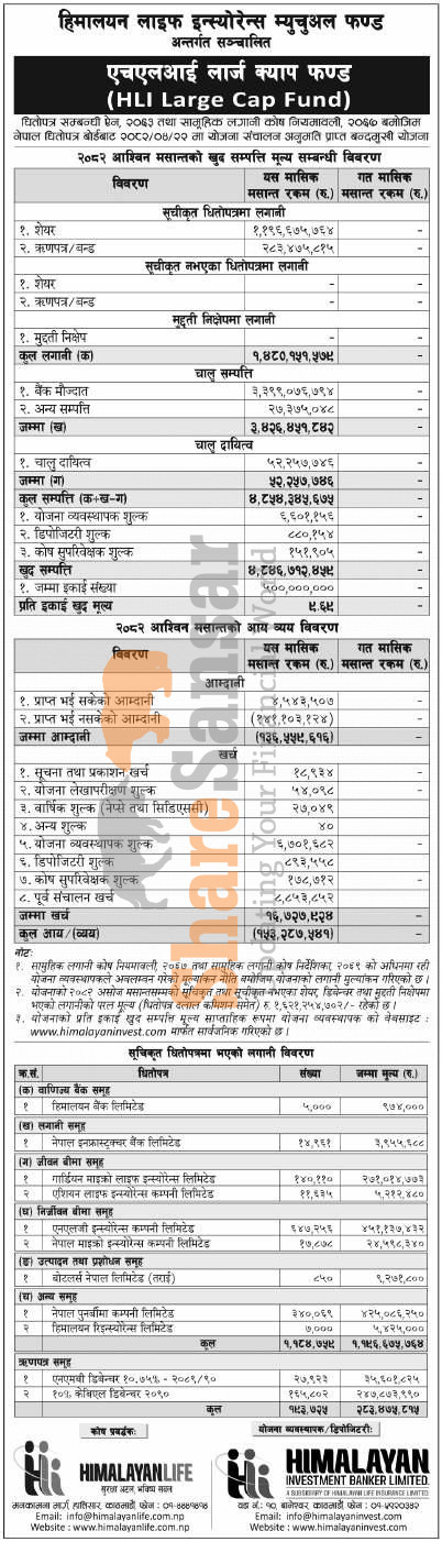Himalayan Investment Banker Limited has published "HLI Large Cap Fund" Net Assets Value (NAV) till Ashwin, 2082.