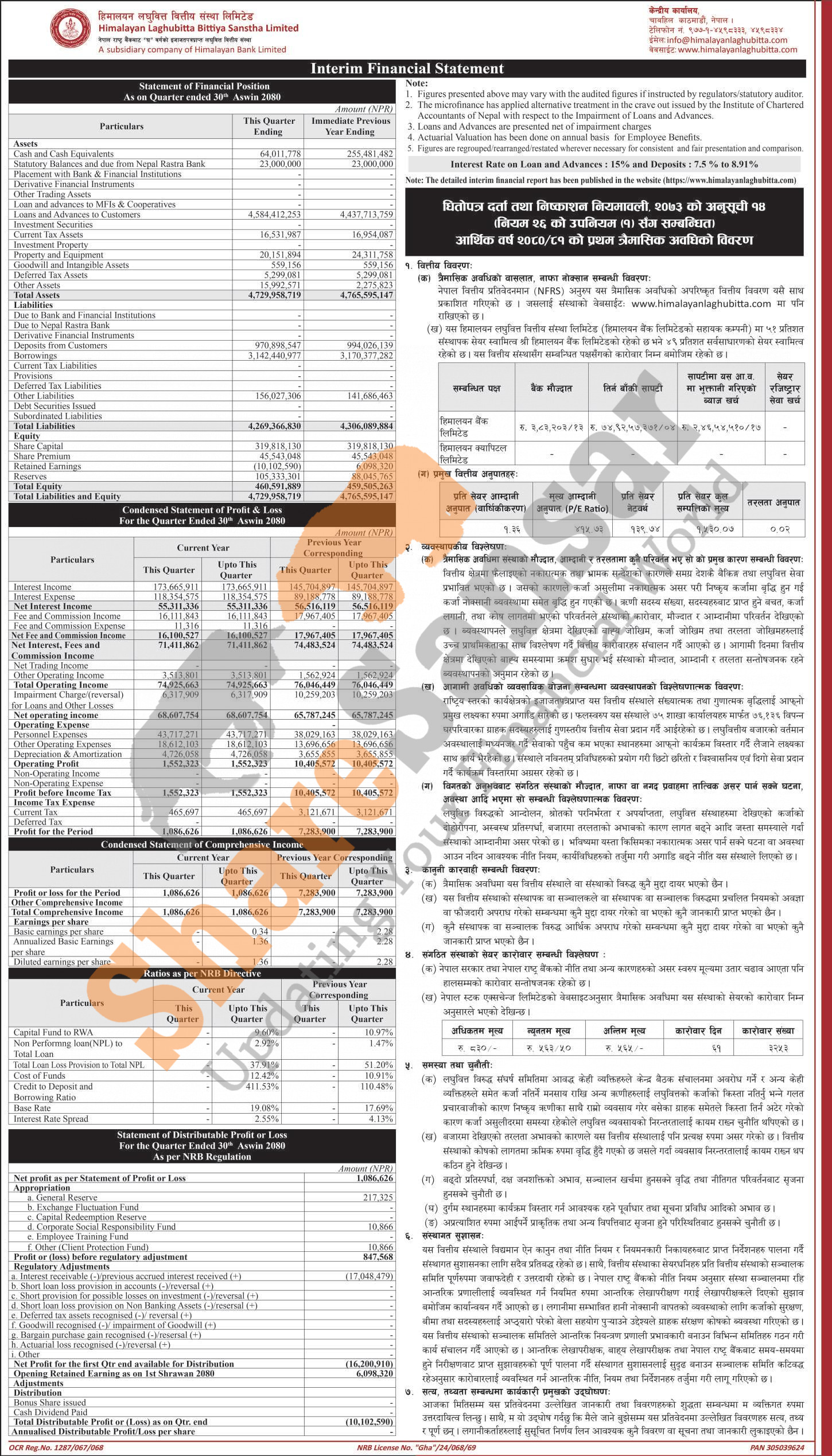 Himalayan Laghubitta Bittiya Sanstha Limited has posted a net profit of Rs 1.08 million and published its 1st quarter company analysis of the fiscal year 2080/81.