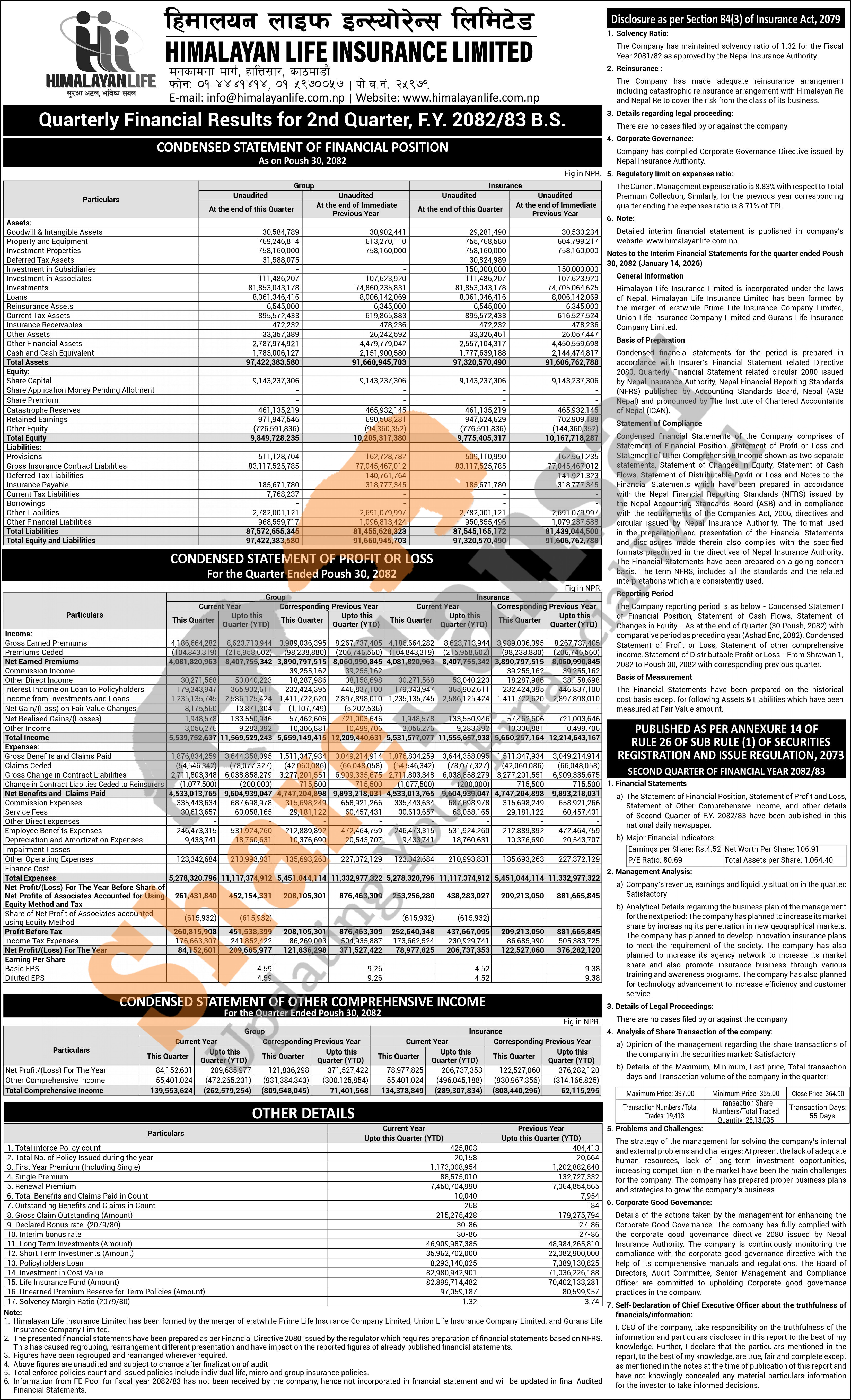 Himalayan Life Insurance Limited has posted a net profit of Rs 206.73 million and published its 2nd quarter company analysis of the fiscal year 2082/83.