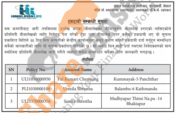 Himalayan Life Insurance Limited has published a notice regarding a claim for lost share certificates.