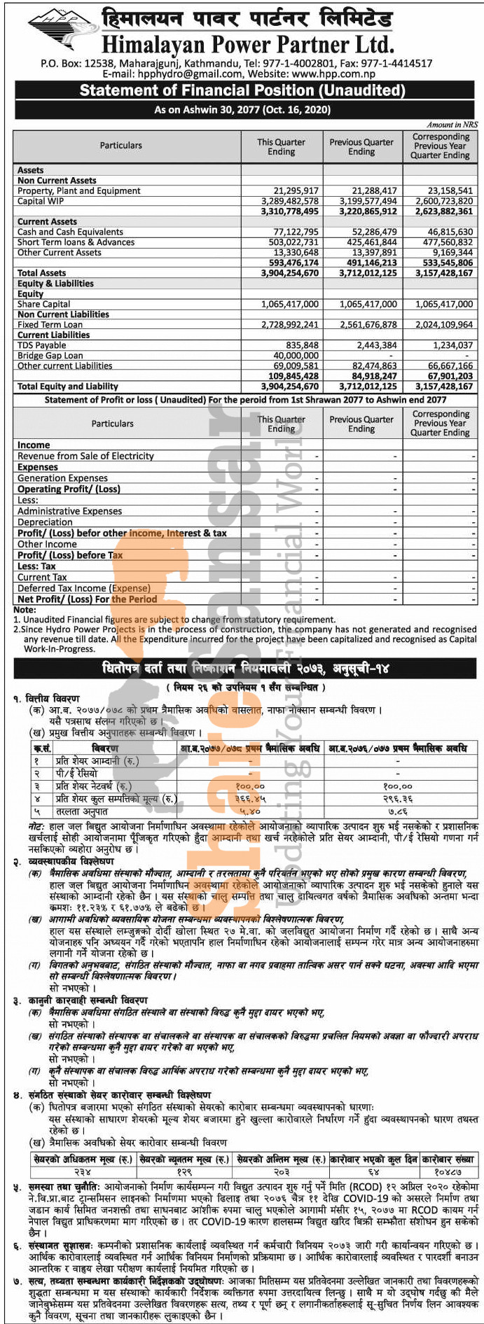 Himalayan Power Partner Limited has published its 1st quarter company analysis of the fiscal year 2077/78.