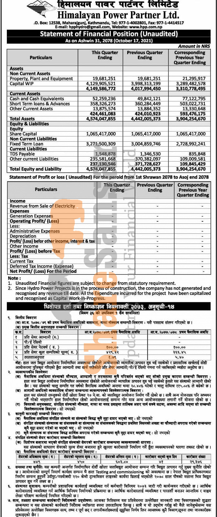 Himalayan Power Partner Limited has published its 1st quarter company analysis of the fiscal year 2078/79.