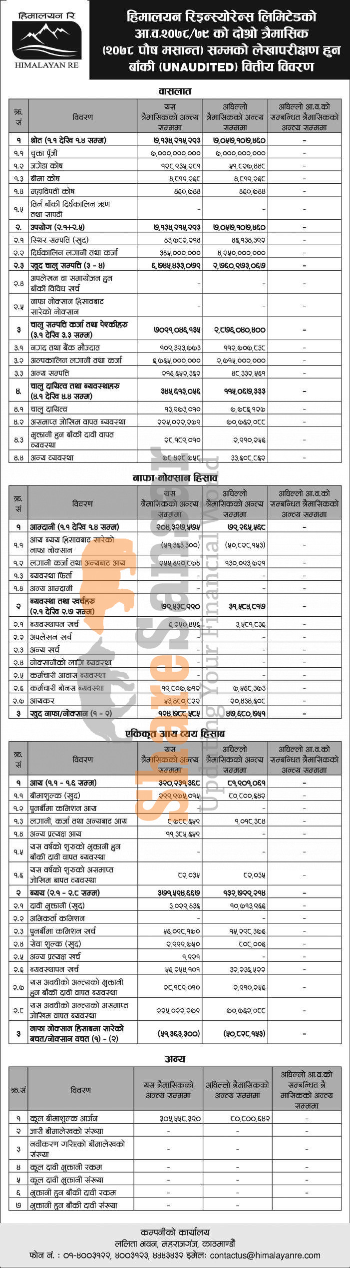 Himalayan Re-Insurance Limited has posted a net profit of Rs 124.78 million and published its 2nd quarter company analysis of the fiscal year 2078/79.