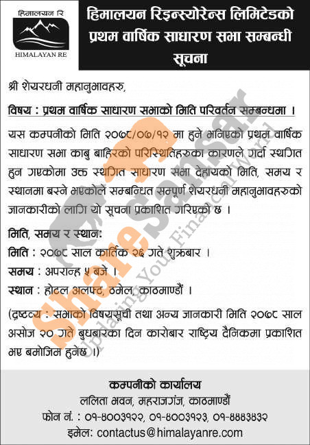 Himalayan Re-insurance Limited has re-announced its 1st AGM going to be held on 26th Kartik, 2078.