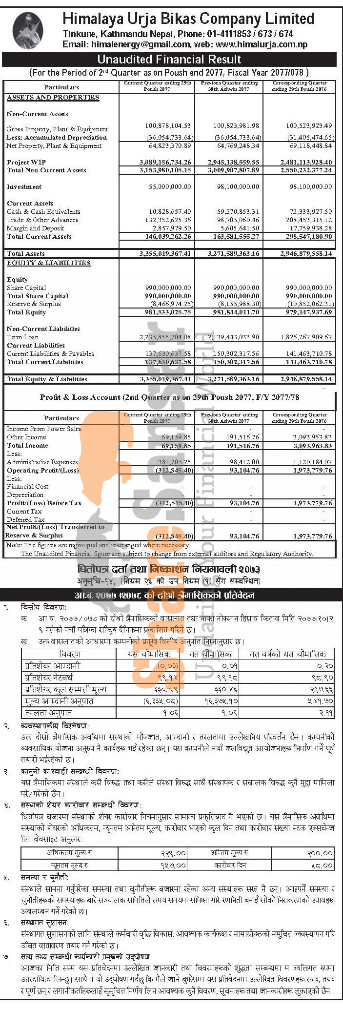 Himalayan Urja Bikas Company Limited has posted a net loss of Rs 3.12 Lakhs and published its 2nd quarter company analysis of the fiscal year 2077/78.