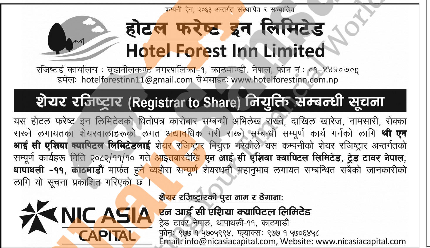 Hotel Forest Inn Limited has appointed NIC Asia Capital Limited as its share registrar.