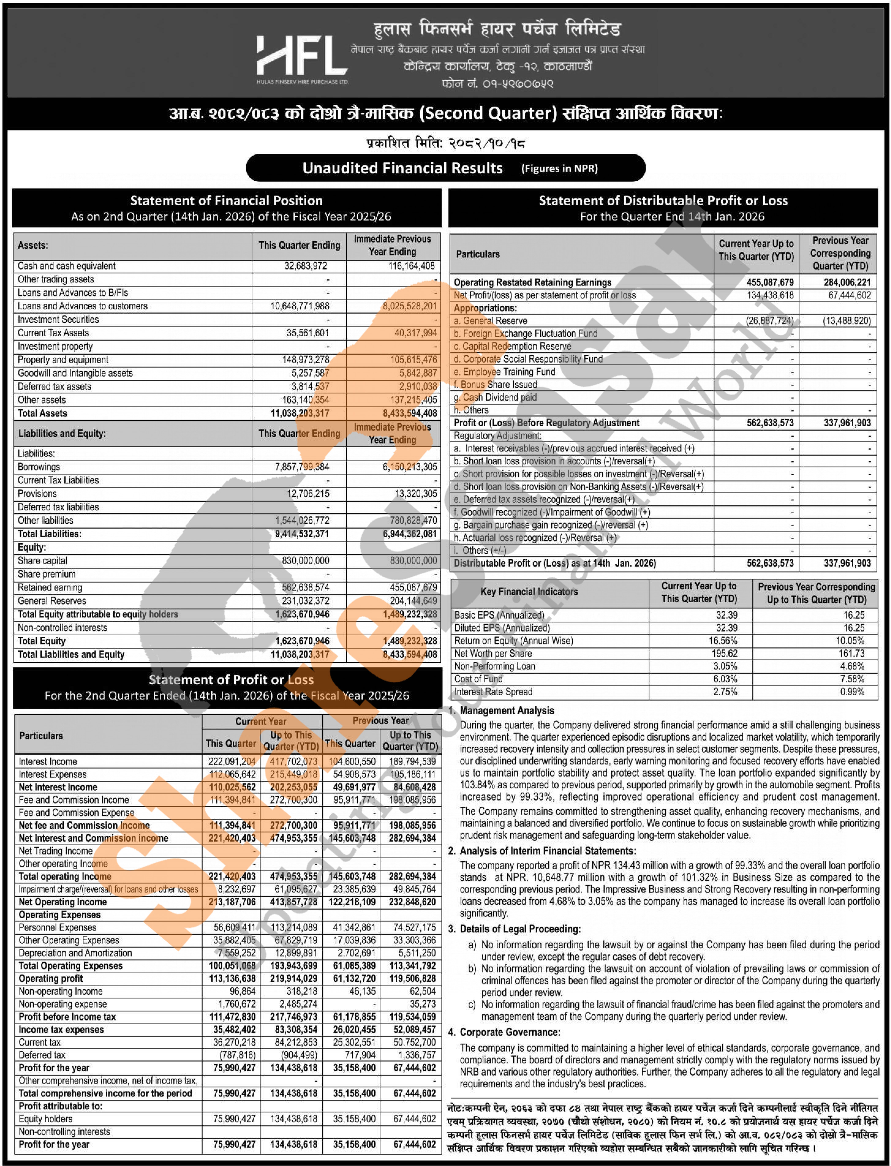Hulas Fin Serve Hire Purchase Limited has posted a net profit of Rs 134.43 million and published its 2nd quarter company analysis of the fiscal year 2082/83.