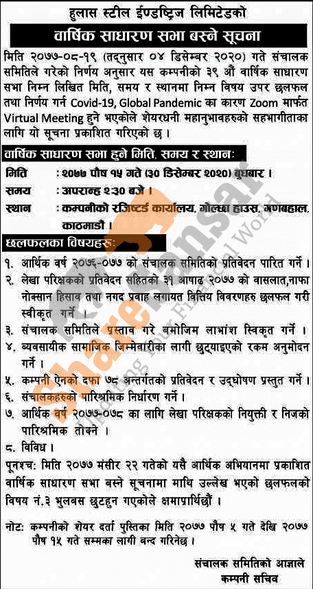Hulas Steel Industries Limited has announced its 39th AGM going to be held on 15th Poush, 2077.