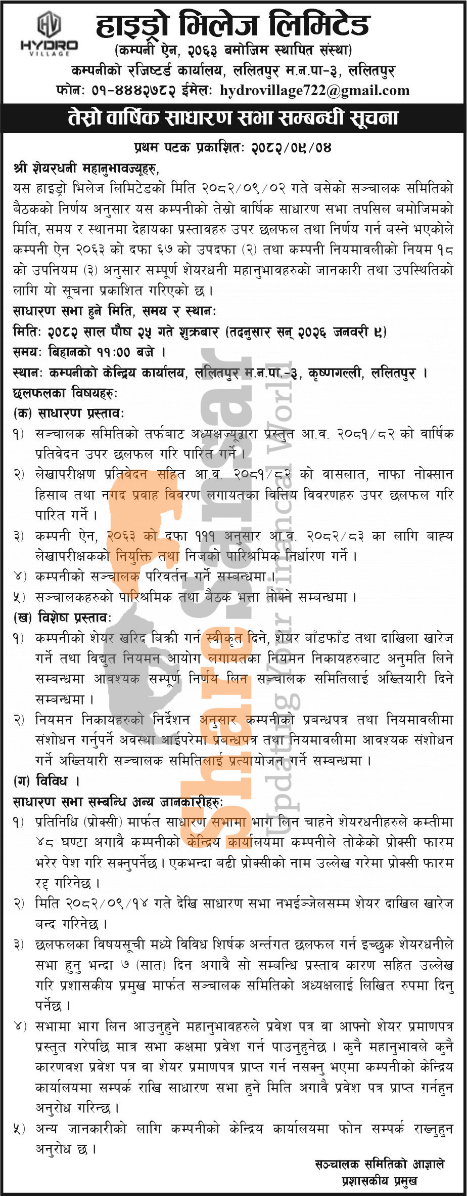 Hydro Village Limited has announced its 3rd AGM going to be held on 25th Poush, 2082.