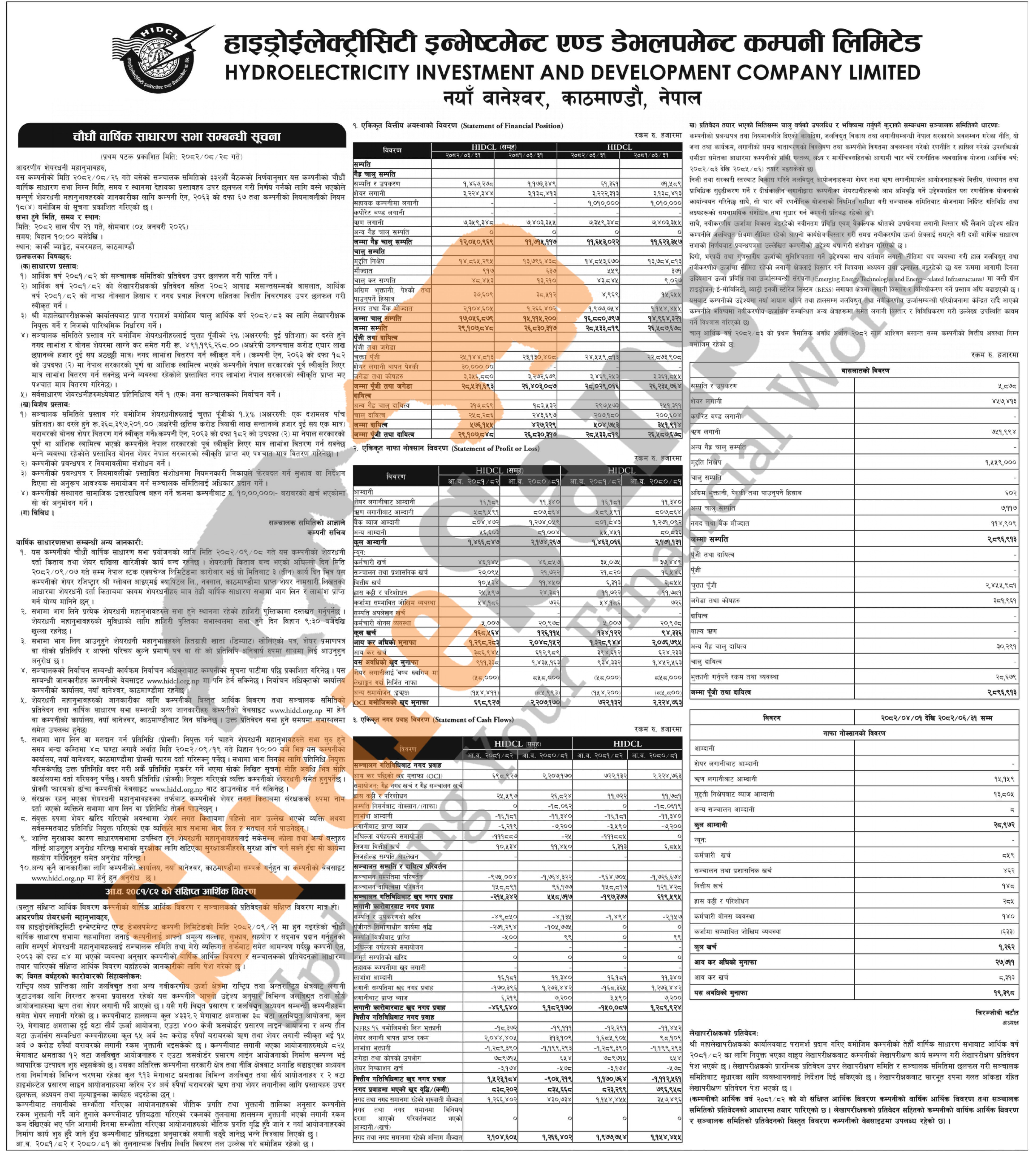 Hydroelectricity Investment and Development Company Limited has announced its 14th AGM going to be held on 21st Poush, 2082 and published its annual financial statement of the fiscal year 2081/82.