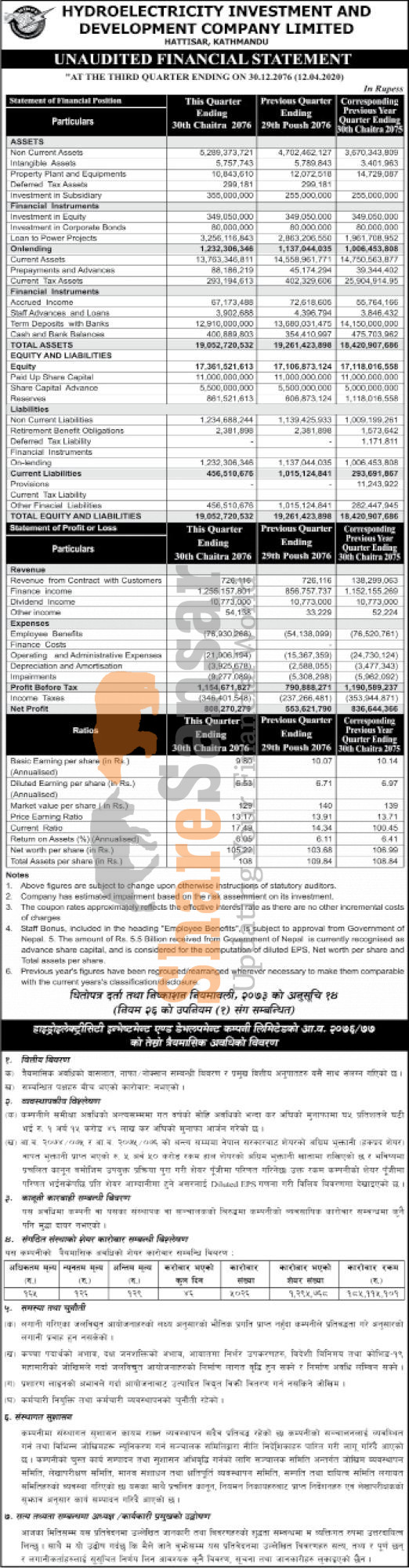 Hydroelectricity Investment and Development Company Limited has posted a net profit of Rs 808.27 million and published its 3rd quarter company analysis of the fiscal year 2076/77.