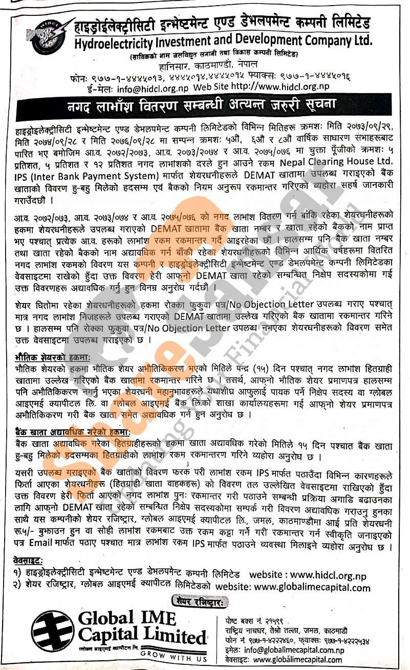 Hydroelectricity Investment and Development Company Limited is distributing cash dividend directly to bank accounts of its shareholders and has urged to dematerialize their shares.