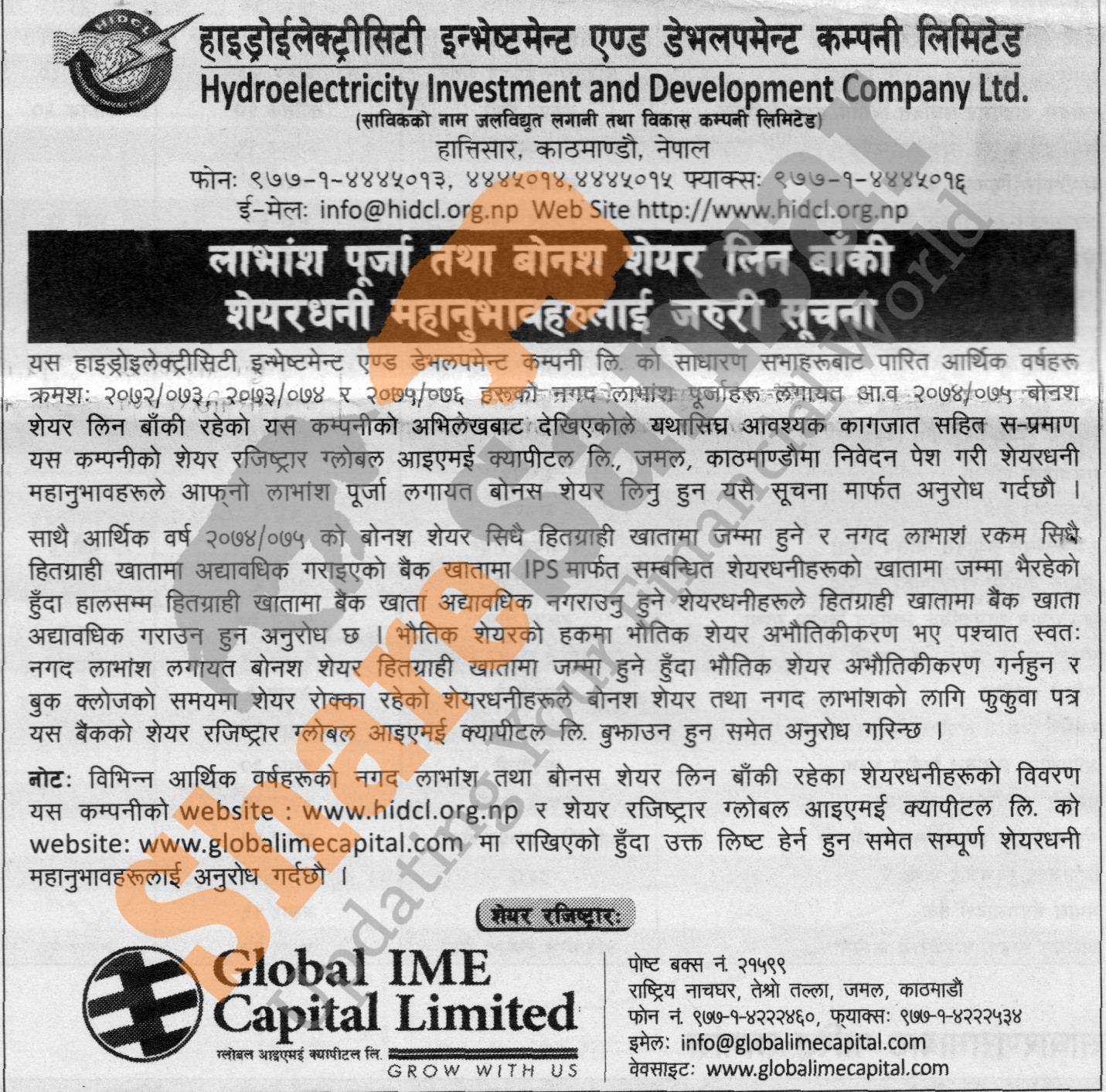 Hydroelectricity Investment and Development Company Limited urges its shareholders to collect uncollected due dividends.