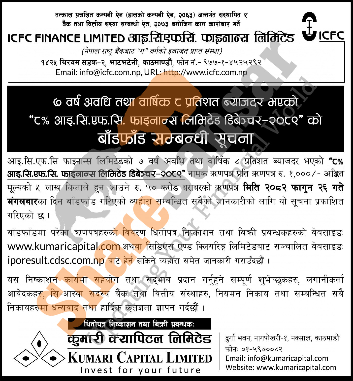 ICFC Finance Limited has allotted its (5,00,000 units @ Rs.1000 per unit) "8% ICFC Finance Limited Debenture 2089" to the general public on 26th Falgun, 2082.