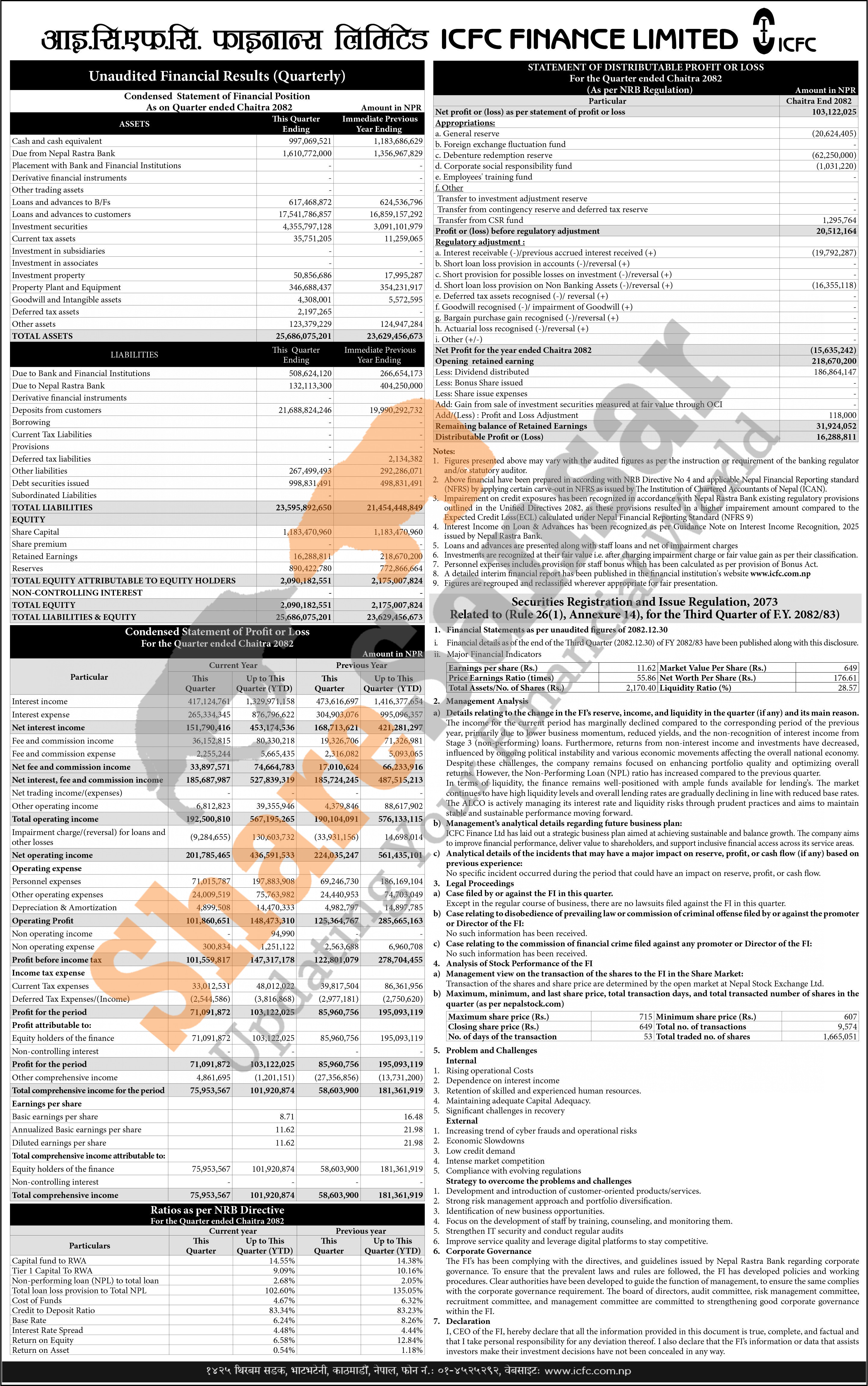 ICFC Finance Limited has posted a net profit of Rs 103.12 million and published its 3rd quarter company analysis of the fiscal year 2082/83.