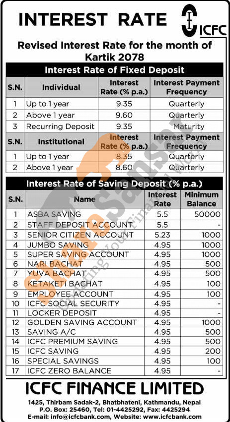 ICFC Finance Limited has published a notice regarding new revised interest rate for the month of Kartik, 2078.