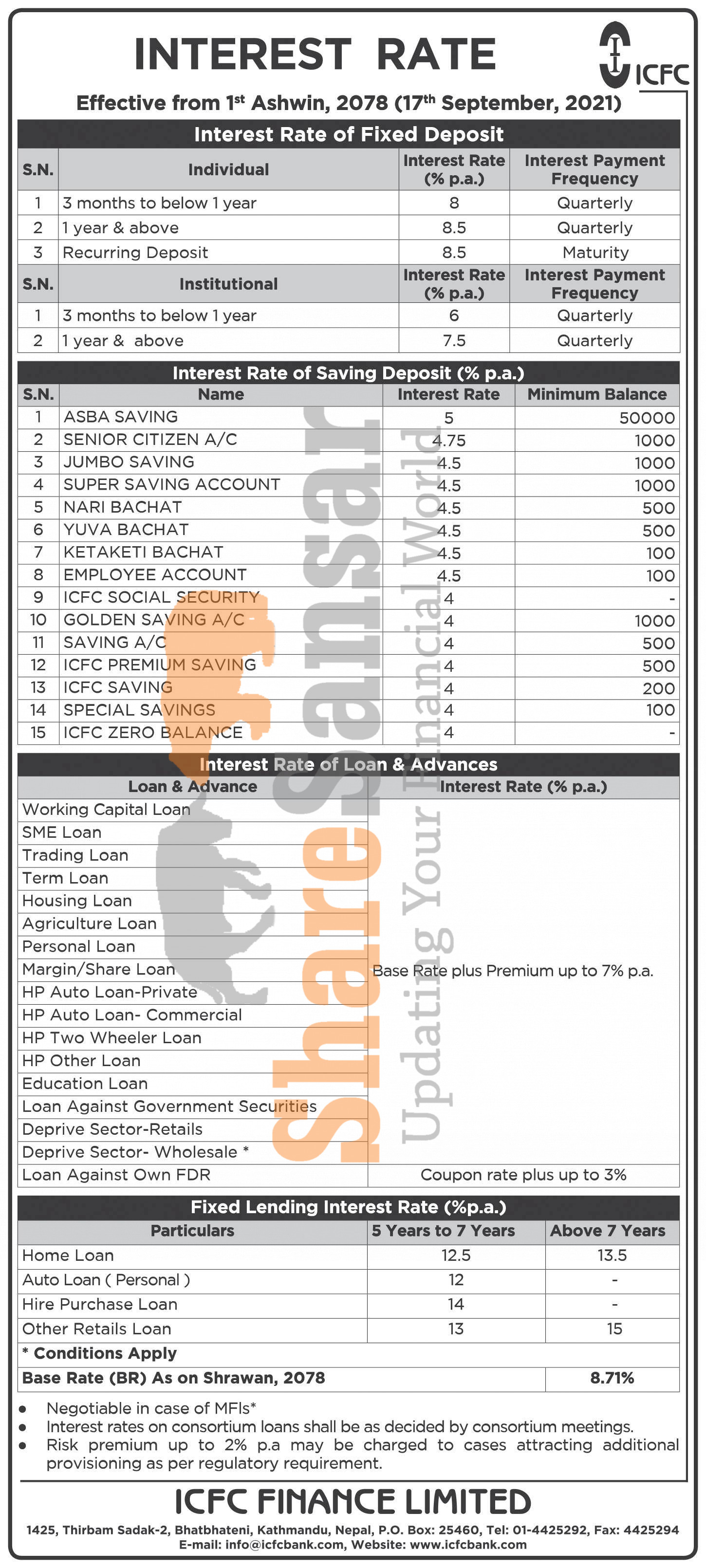 ICFC Finance Limited has published a notice regarding the new interest rate for deposit and loan products and it's effective from 1st Ashoj, 2078.