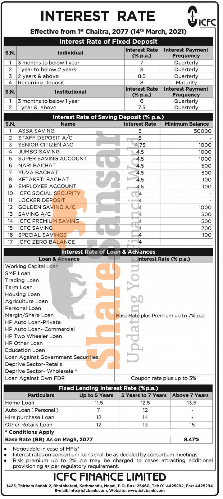 ICFC Finance Limited has published a notice regarding the new interest rate for deposit and loan products and it's effective from 1st Chaitra, 2077.