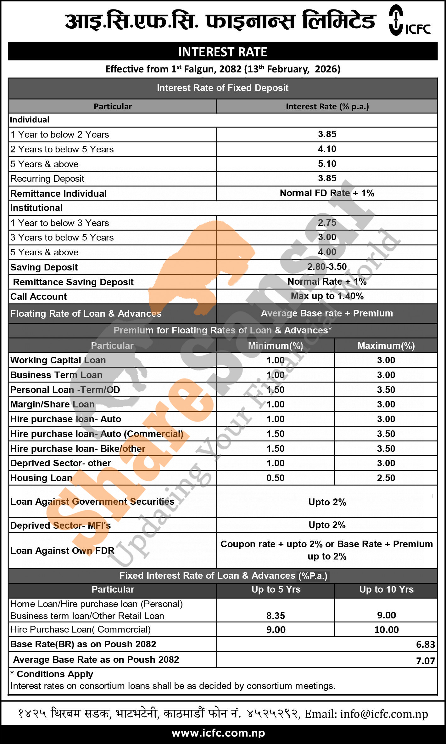 ICFC Finance Limited has published a notice regarding the new interest rate for deposit and loan products and it's effective from 1st Falgun, 2082.