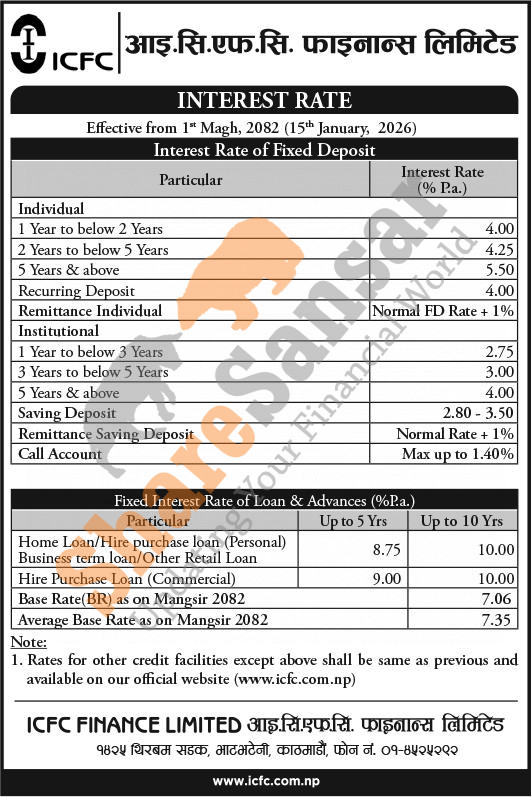 ICFC Finance Limited has published a notice regarding the new interest rate for deposit and loan products and it's effective from 1st Magh, 2082.