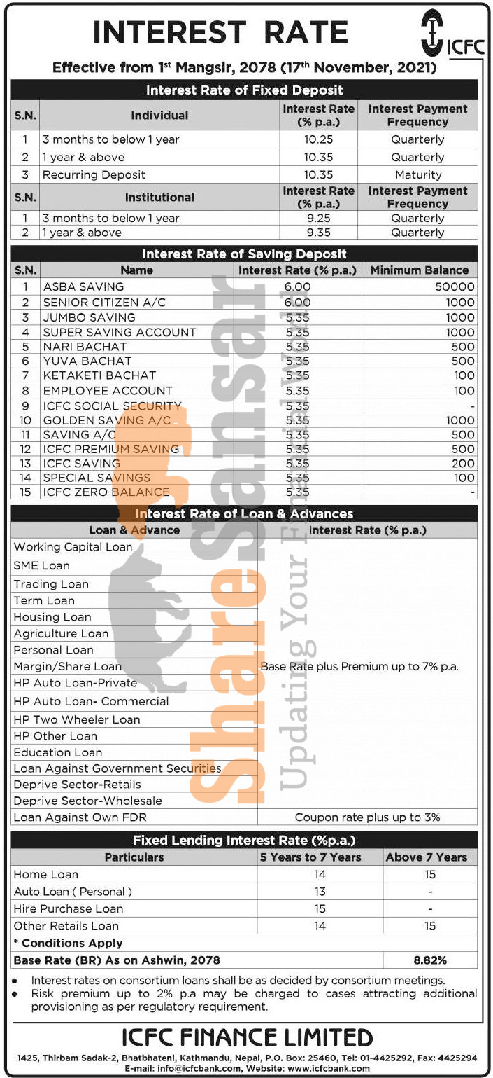 ICFC Finance Limited has published a notice regarding the new interest rate for its deposit and loan products and it's effective from 1st Mangshir, 2078.