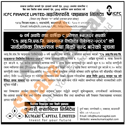 ICFC Finance Limited is closing its (5,00,000 units @ Rs.1000 per unit) "8% ICFC Finance Limited Debenture 2089" to the general public from today (14th Falgun, 2082).