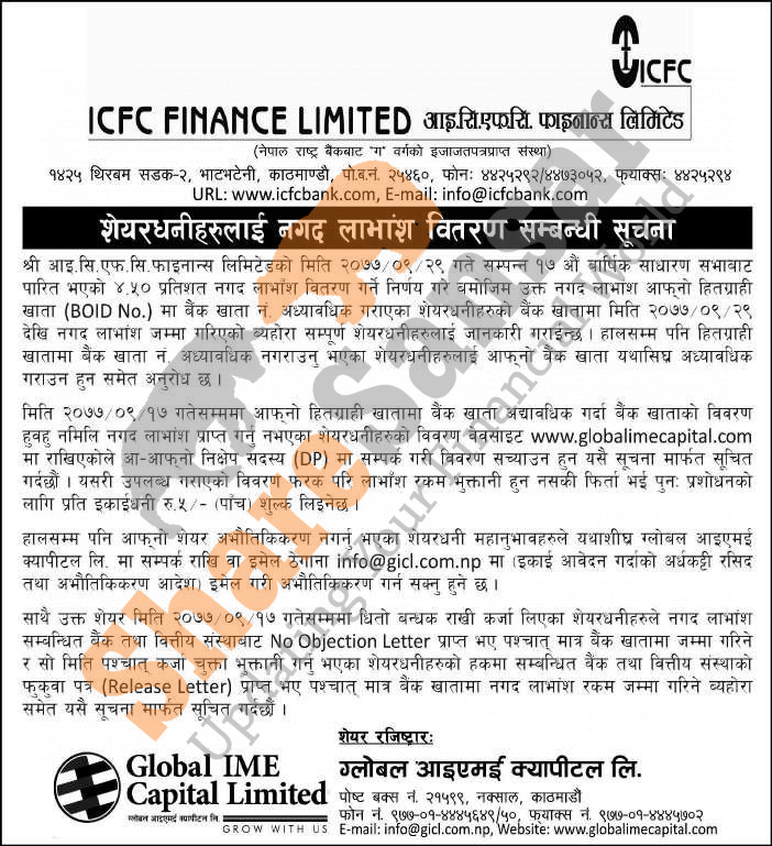 ICFC Finance Limited is distributing 4.50% cash dividend directly to bank accounts and has urged its shareholders to dematerialize their shares.