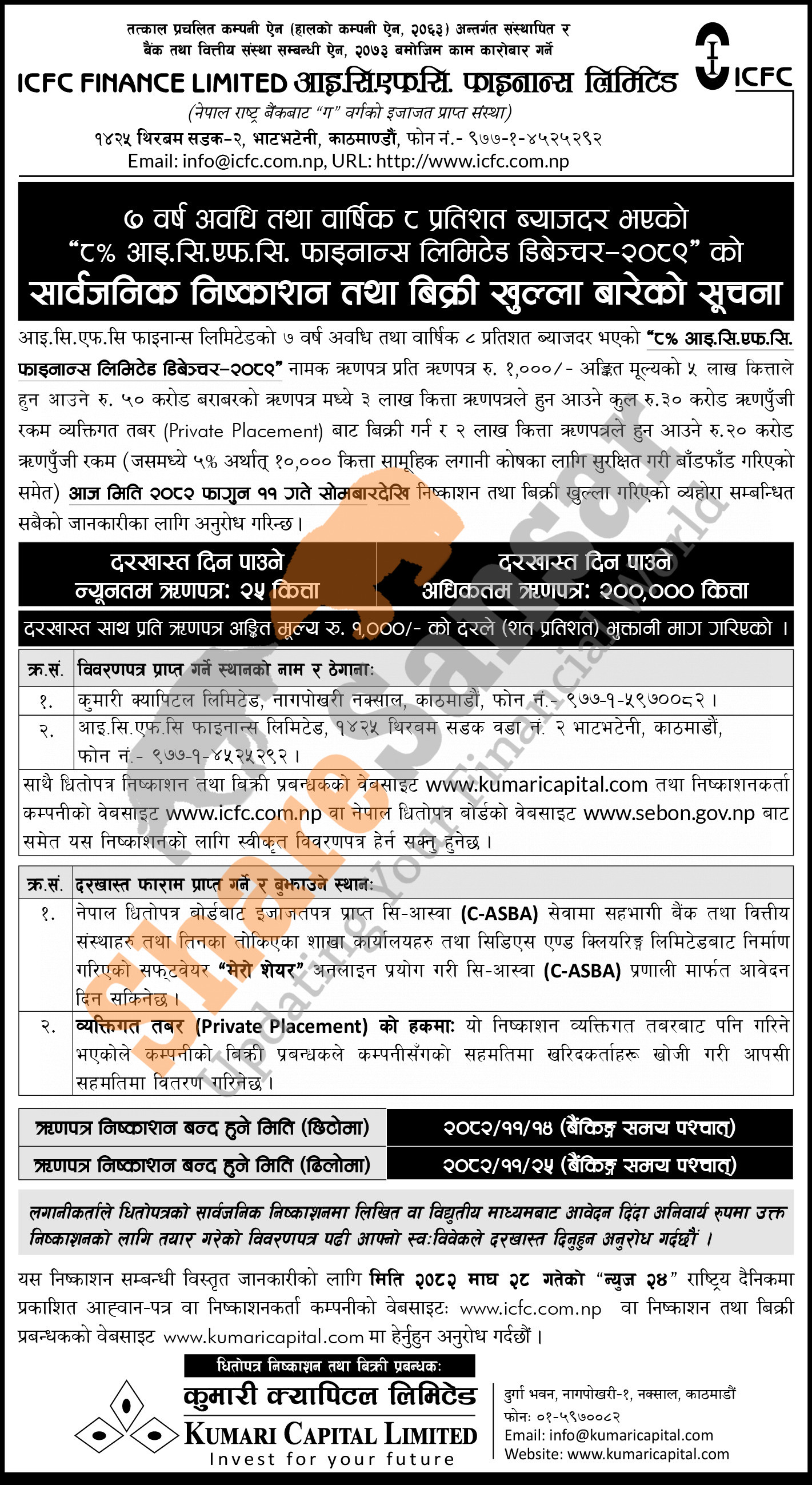 ICFC Finance Limited is opening its (5,00,000 units @ Rs.1000 per unit) "8% ICFC Finance Limited Debenture 2089" to the general public from today (11th Falgun, 2082).