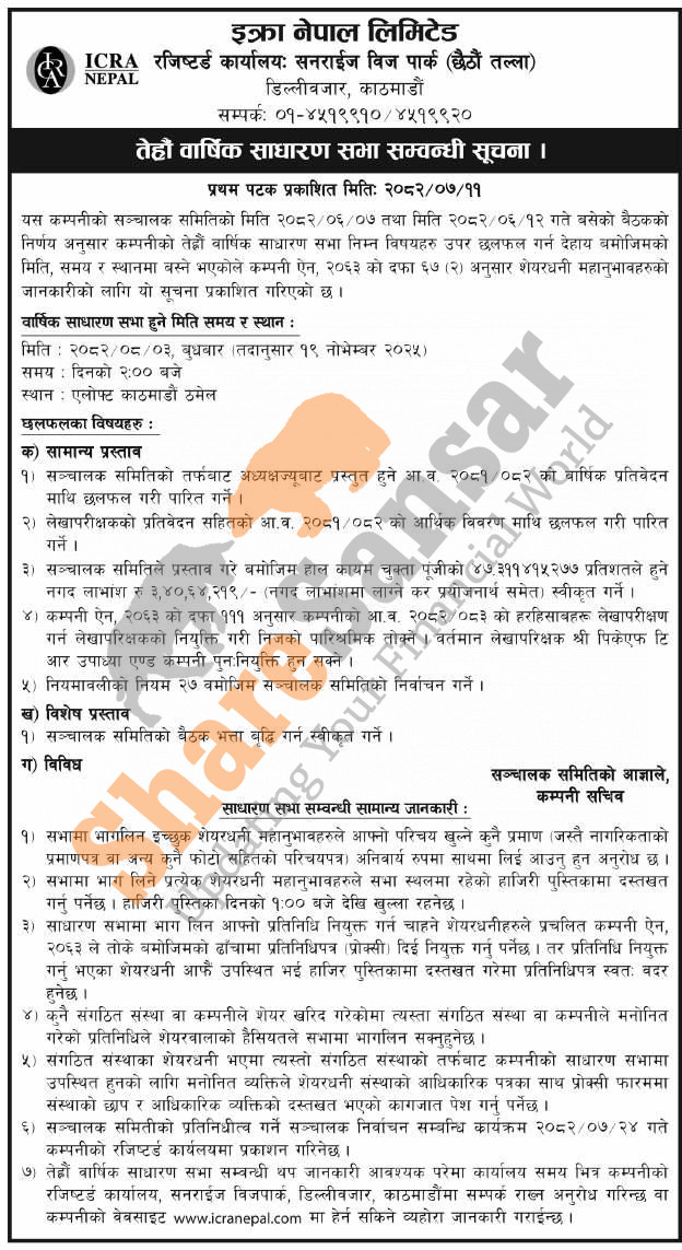 ICRA Nepal Limited has announced its 13th AGM going to be held on 3rd Mangsir, 2082.