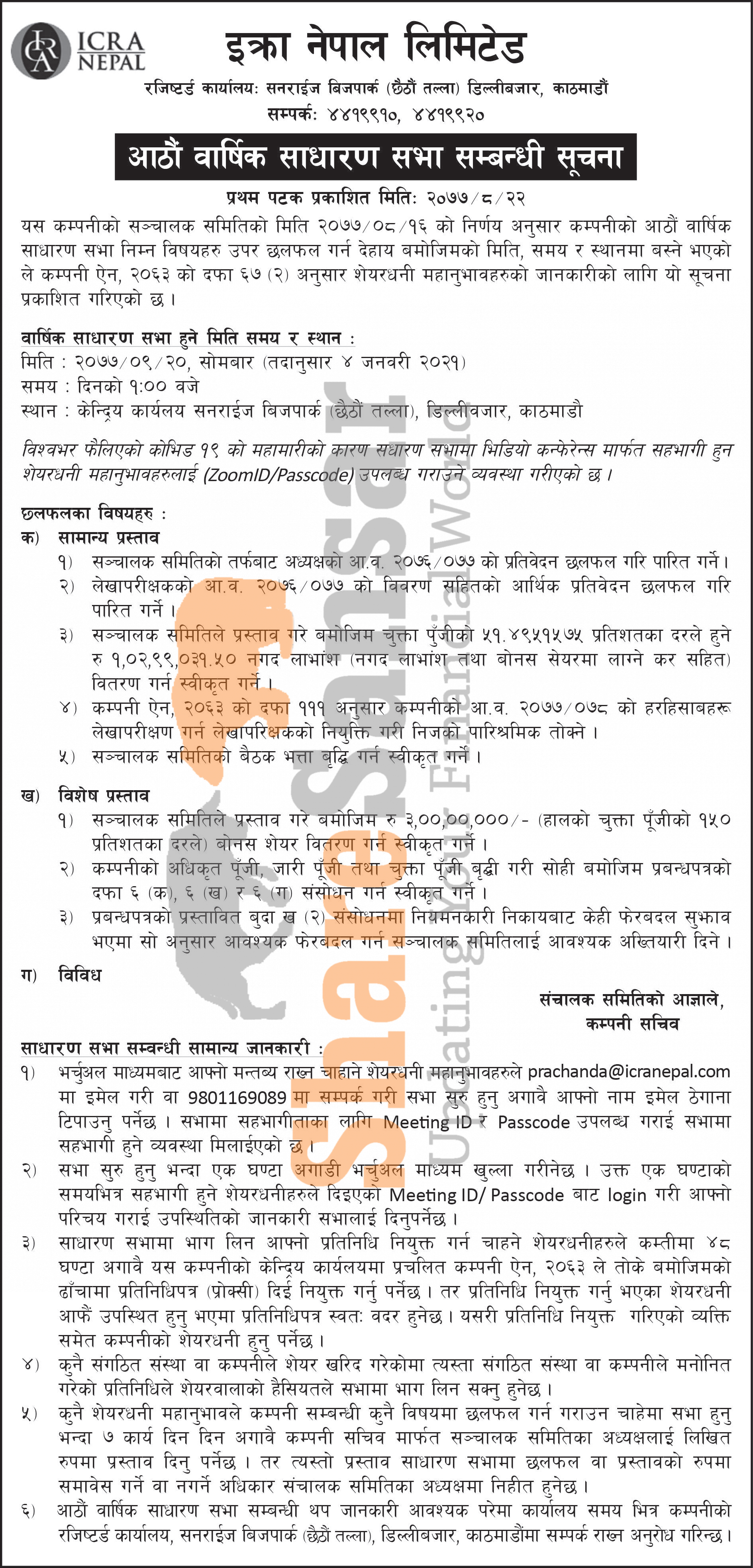 ICRA Nepal Limited has announced its 8th AGM going to be held on 20th Poush, 2077.