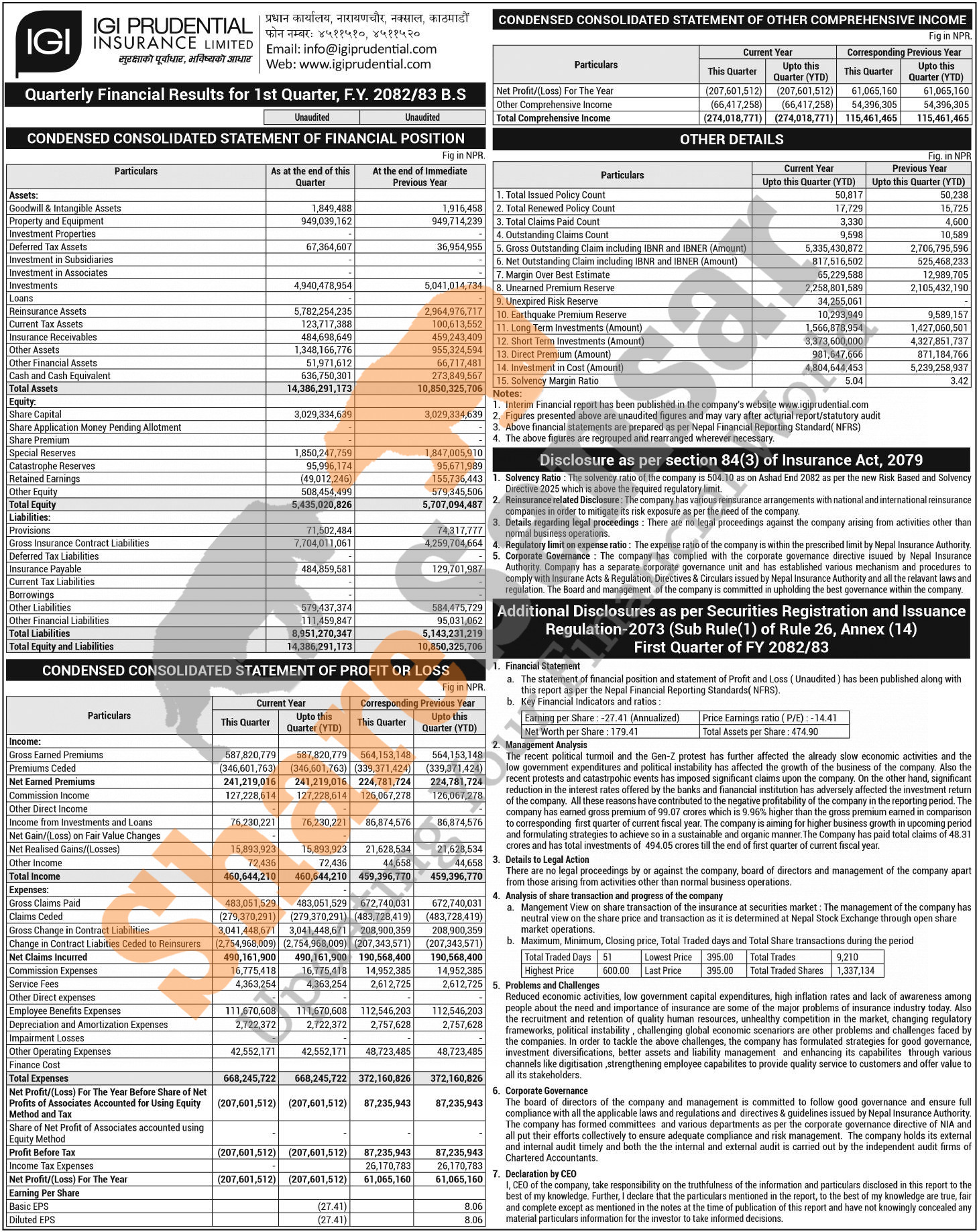 IGI Prudential Insurance Limited has posted a net loss of Rs 207.60 million and published its 1st quarter company analysis of the fiscal year 2082/83.