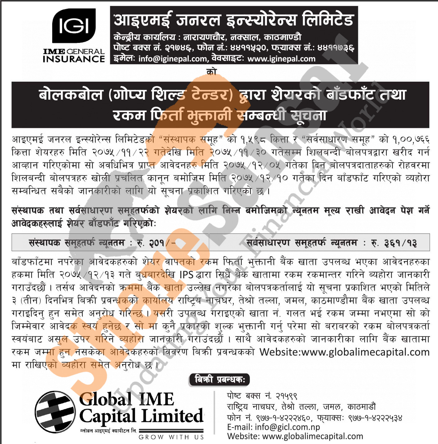 IME General Insurance Limited has allotted its 1,598 unit promoter shares and 1,00,766 unit ordinary shares in auction to the general public on 10th Chaitra, 2075 and refunding money to non-allottee investors from (13th Chaitra, 2075).