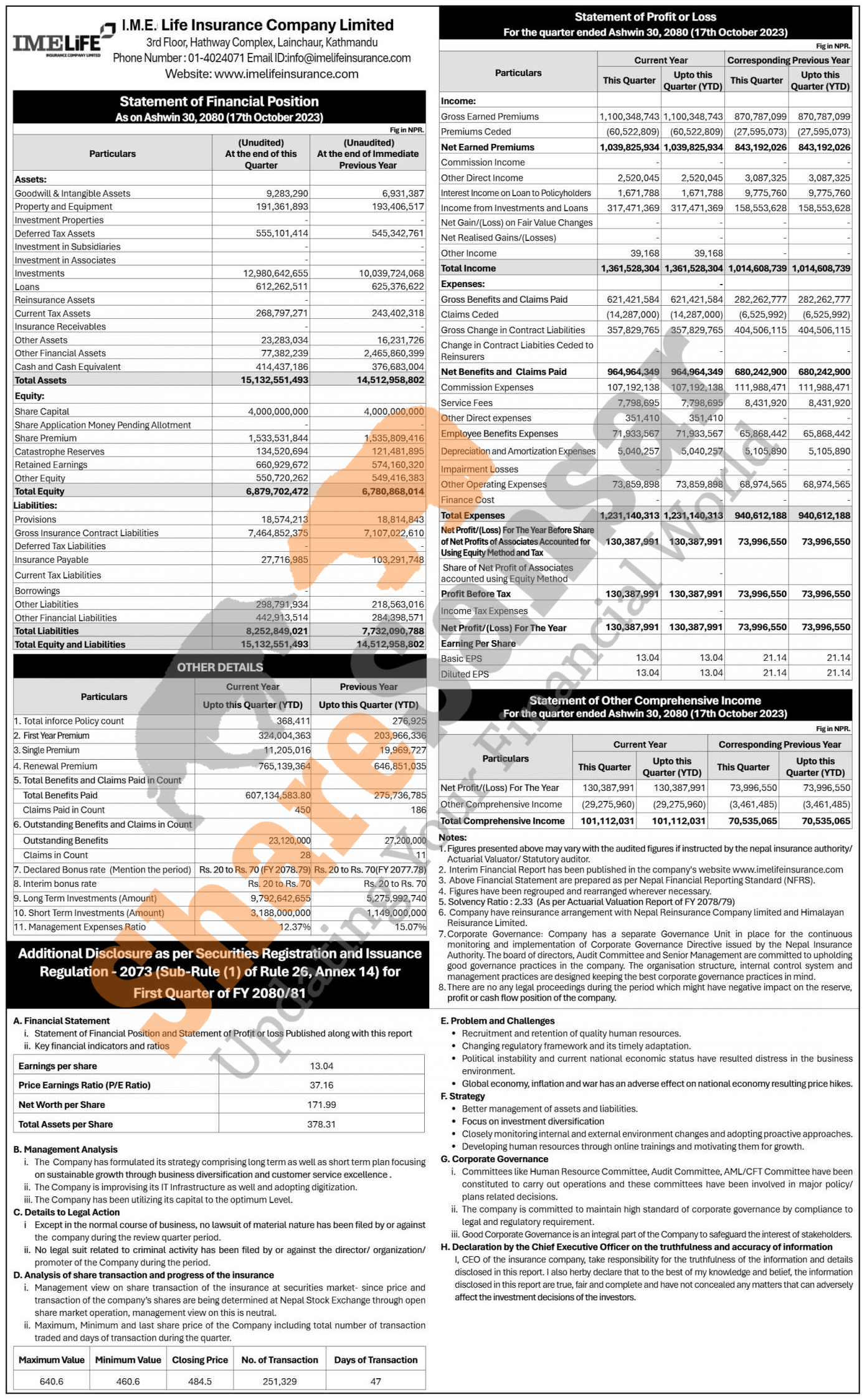 IME Life Insurance Company Limited has posted a net profit of Rs 130.38 million and published its 1st quarter company analysis of the fiscal year 2080/81.