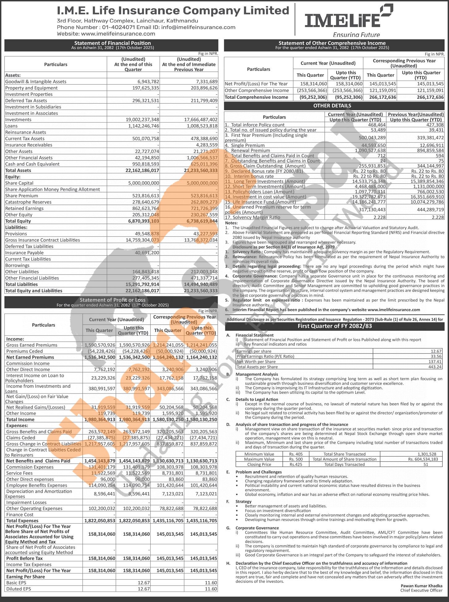 IME Life Insurance Company Limited has posted a net profit of Rs 158.31 million and published its 1st quarter company analysis of the fiscal year 2082/83.