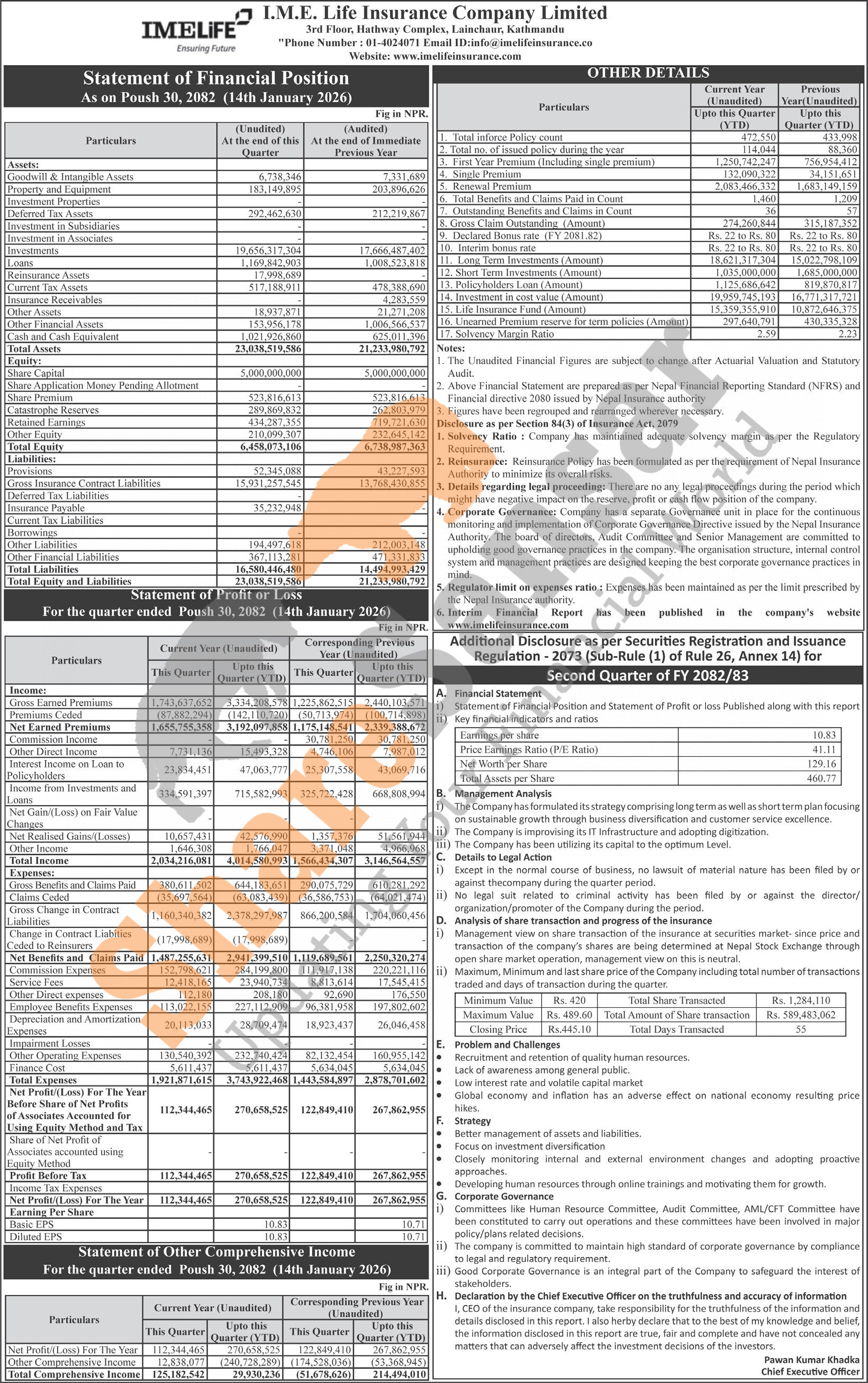 IME Life Insurance Company Limited has posted a net profit of Rs 270.65 million and published its 2nd quarter company analysis of the fiscal year 2082/83.