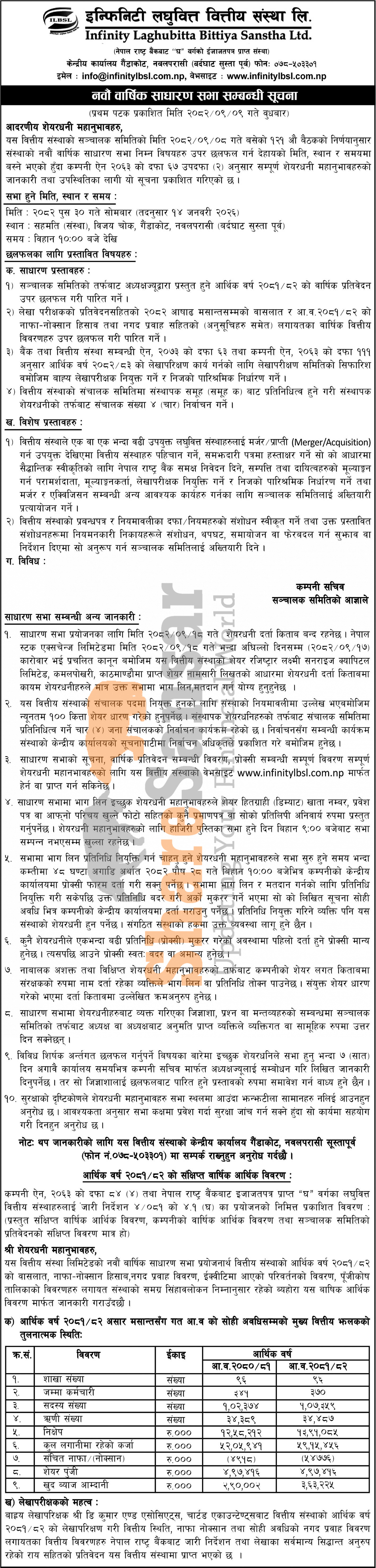 Infinity Laghubitta Bittiya Sanstha Limited has announced its 9th AGM going to be held on 30th Poush, 2082.