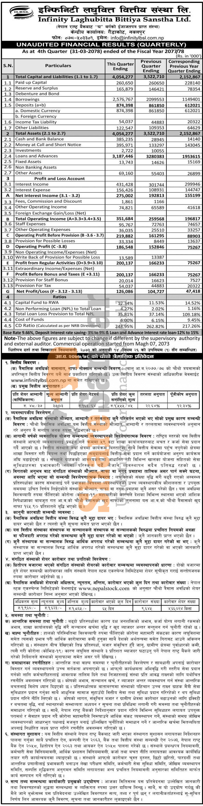 Infinity Laghubitta Bittiya Sanstha Limited has posted a net profit of Rs 126.08 million and published its 4th quarter company analysis of the fiscal year 2077/78.