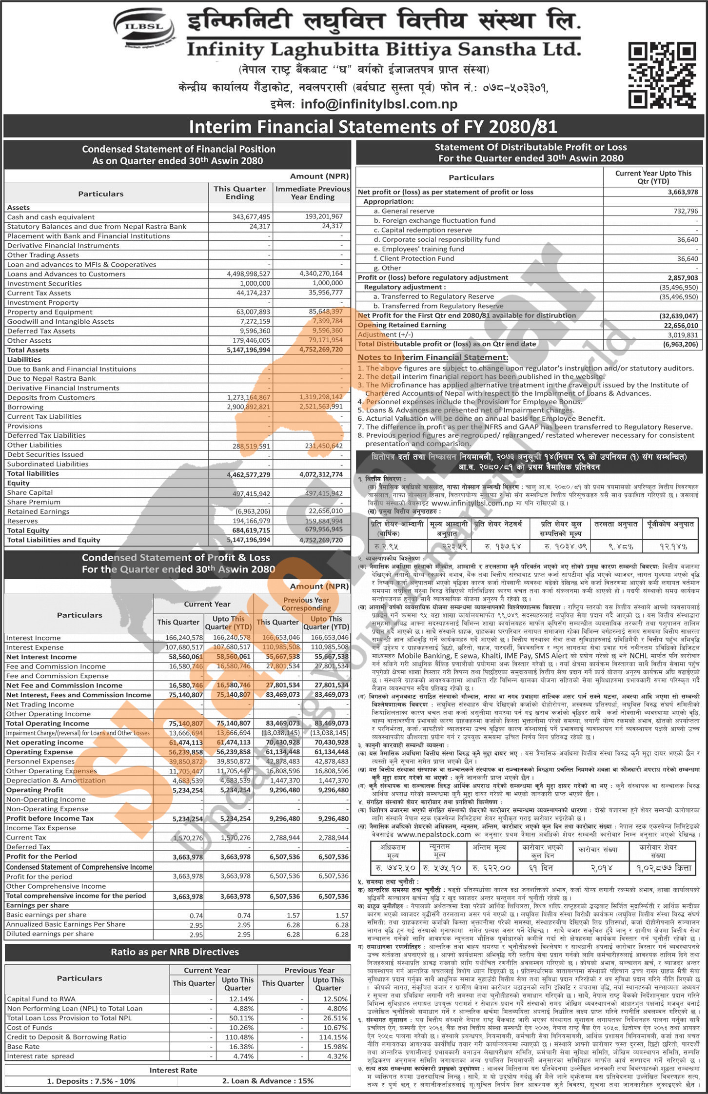 Infinity Laghubitta Bittiya Sanstha Limited has posted a net profit of Rs 3.66 million during the 1st quarter of the fiscal year 2080/81.