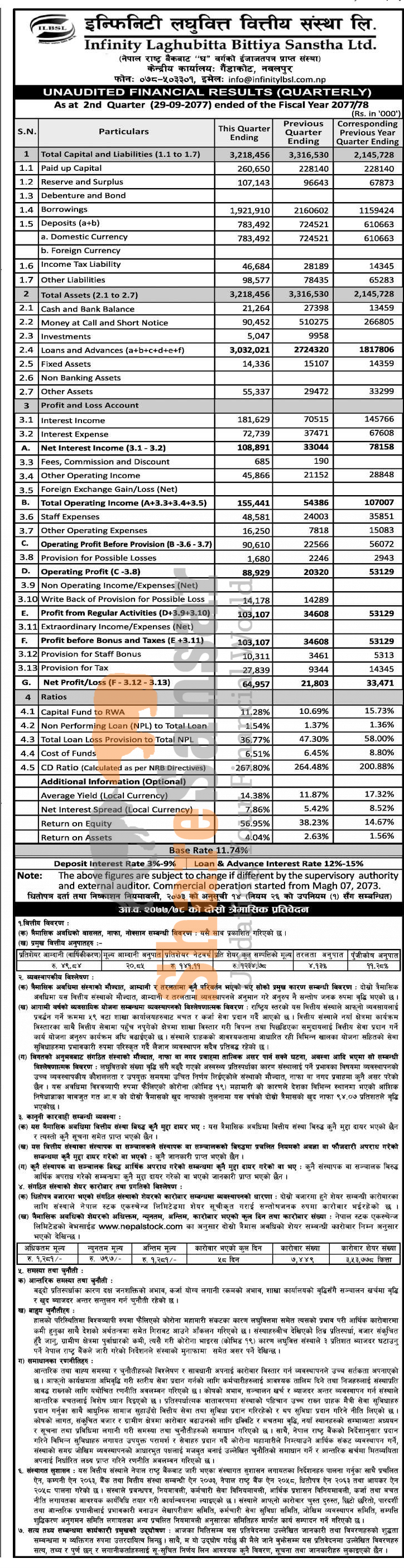 Infinity Laghubitta Bittiya Sanstha Limited has posted a net profit of Rs 64.95 million and published its 2nd quarter company analysis of the fiscal year 2077/78.