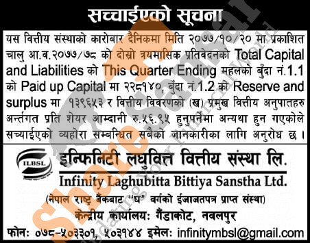 Infinity Laghubitta Bittiya Sanstha Limited has published its correction notice of 2nd quarter company analysis of the fiscal year 2077/78.