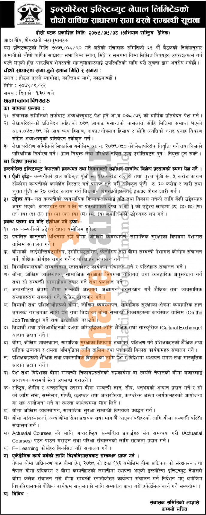 Insurance Institute Nepal Limited has announced its 4th AGM going to be held on 22nd Poush, 2079.