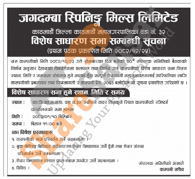 Jagdamba Spinning Mills Limited has announced its SGM going to be held on 10th Baisakh, 2083.