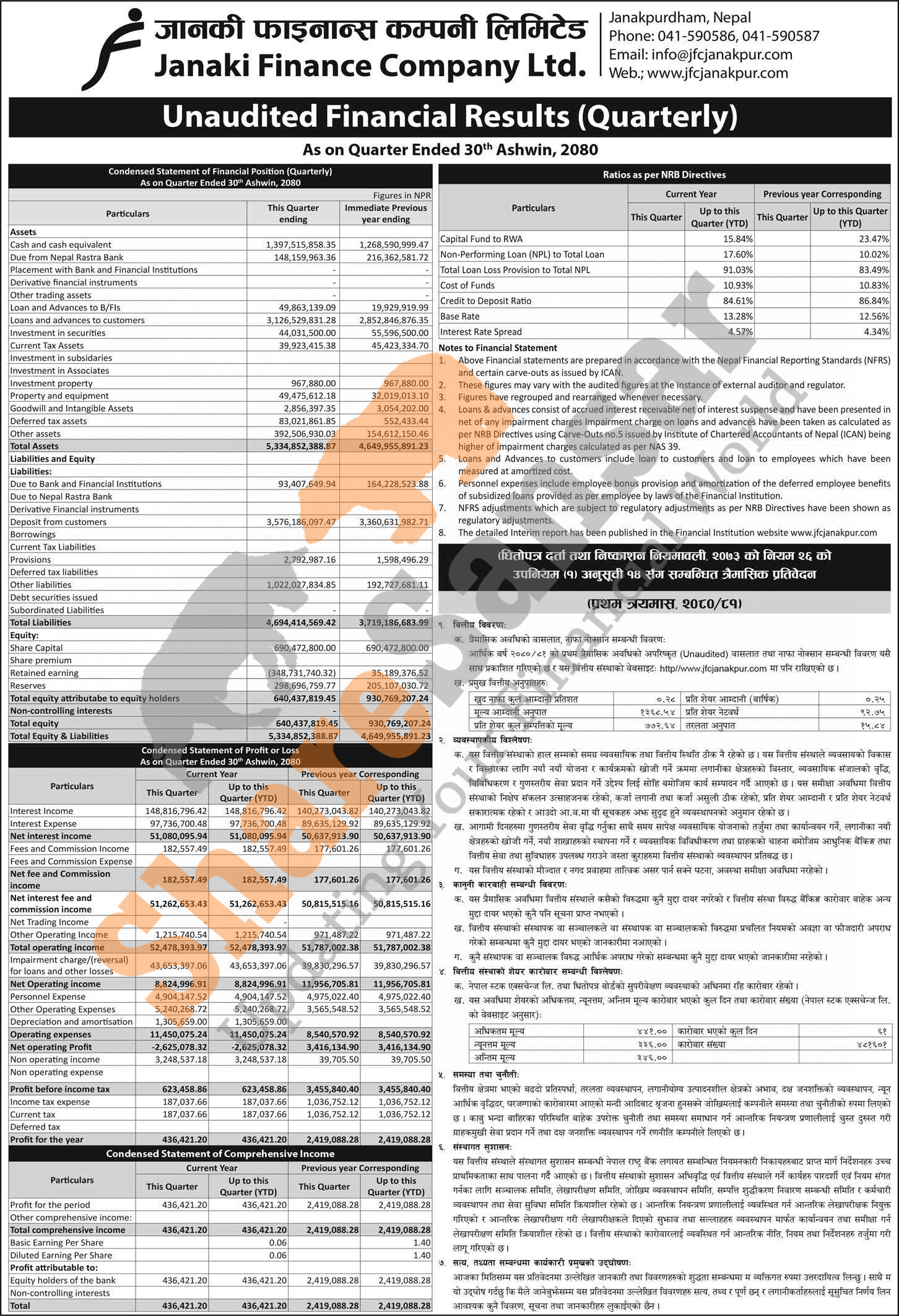 Janaki Finance Company Limited has posted a net profit of Rs 0.43 million and published its 1st quarter company analysis of the fiscal year 2080/81.