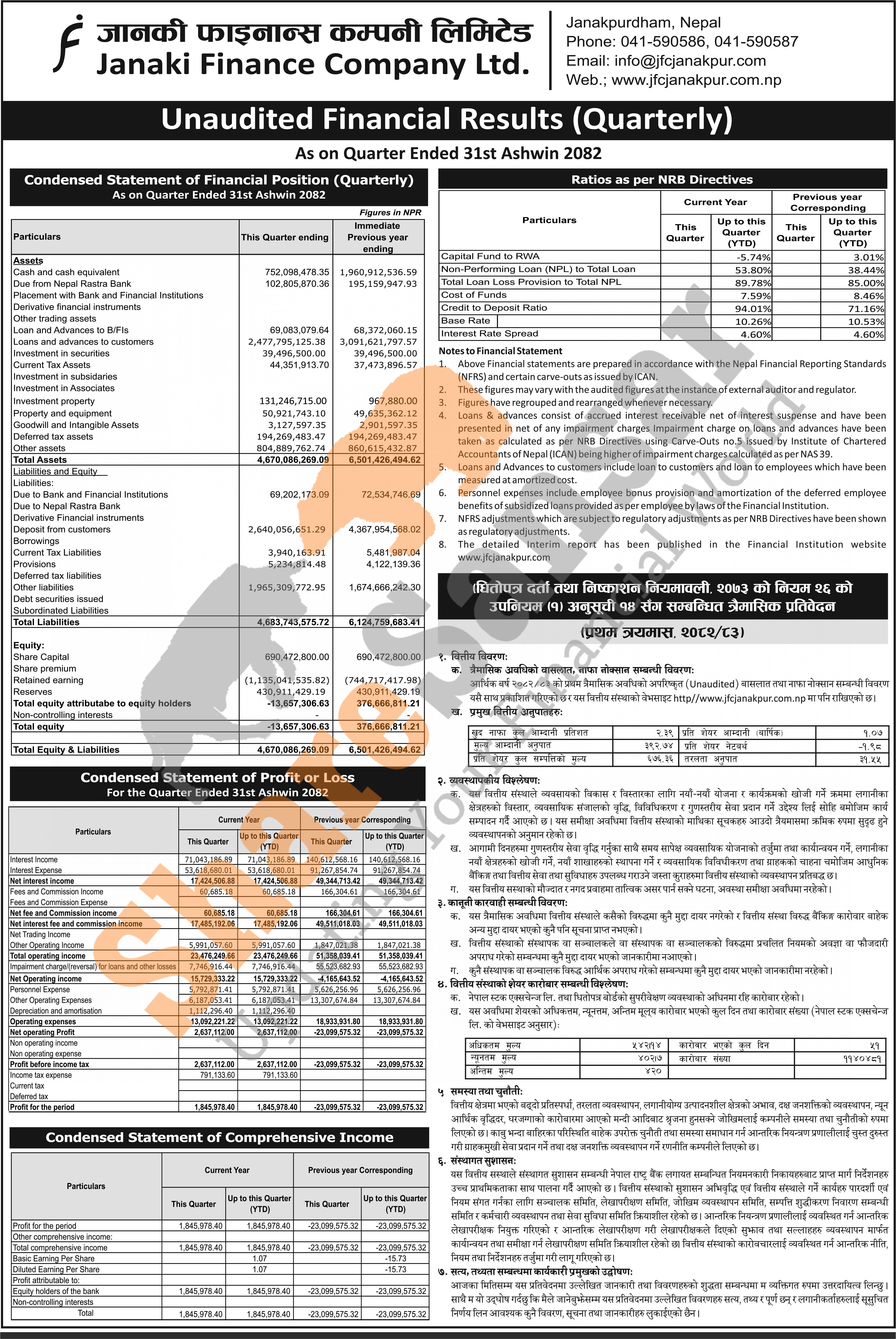 Janaki Finance Company Limited has posted a net profit of Rs 1.84 million and published its 1st quarter company analysis of the fiscal year 2082/83.