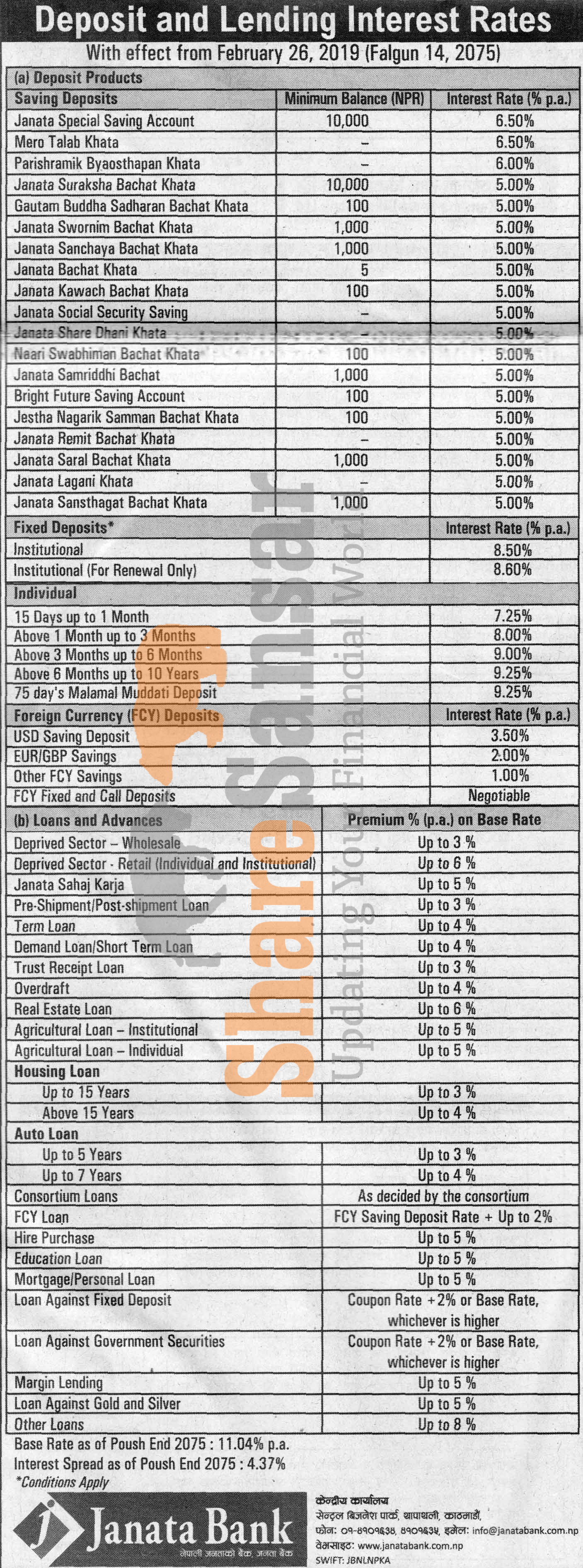 Janata Bank Nepal Limited has published a notice regarding new interest rate and its effective from 14 Falgun, 2075.