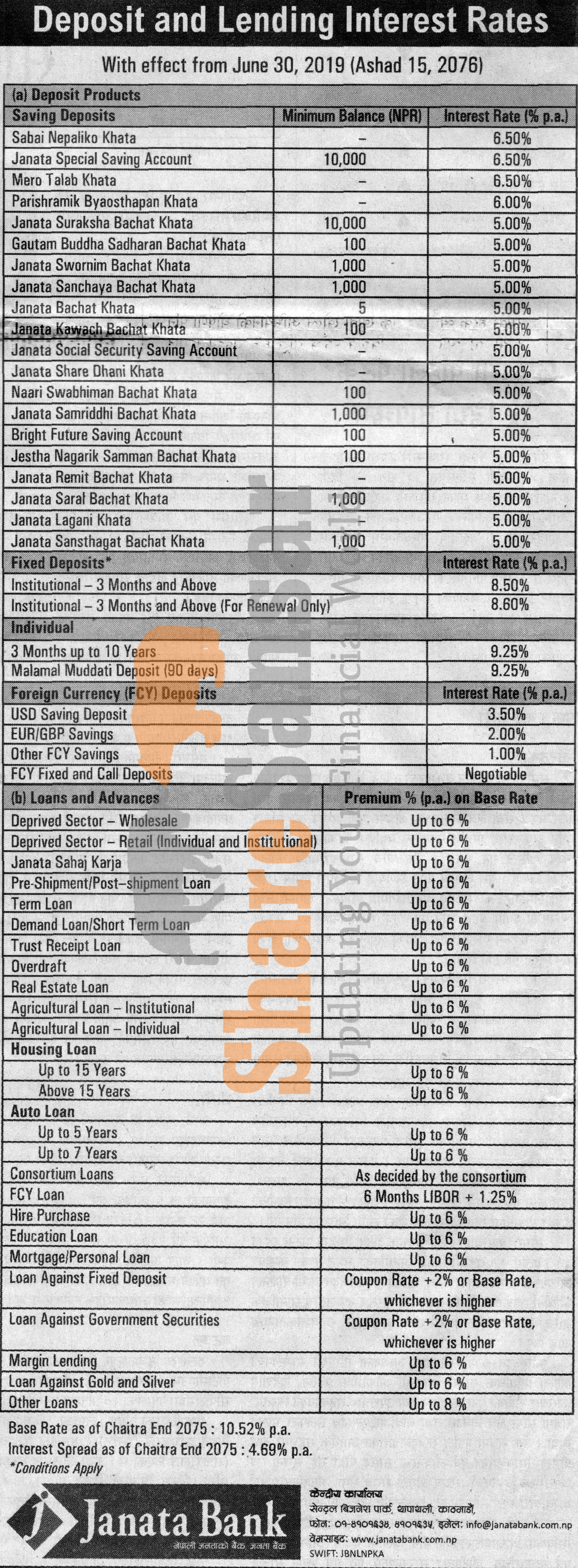 Janata Bank Nepal Limited has published a notice regarding new interest rate and its effective from 15th Ashad, 2076.