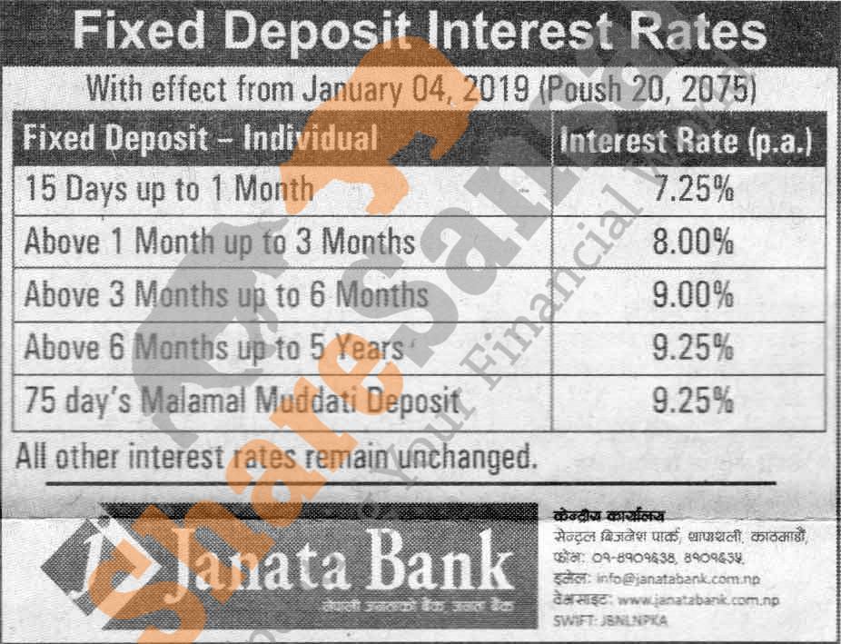 Janata Bank Nepal Limited has published a notice regarding new interest rate and its effective from 20th Poush, 2075.