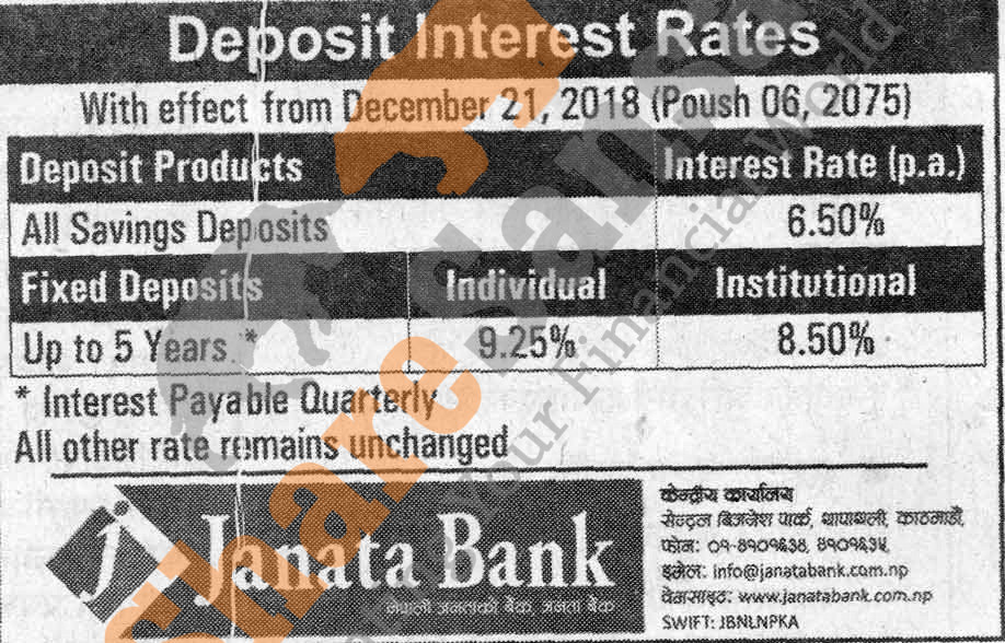 Janata Bank Nepal Limited has published a notice regarding new interest rate and its effective from 6th Poush, 2075.