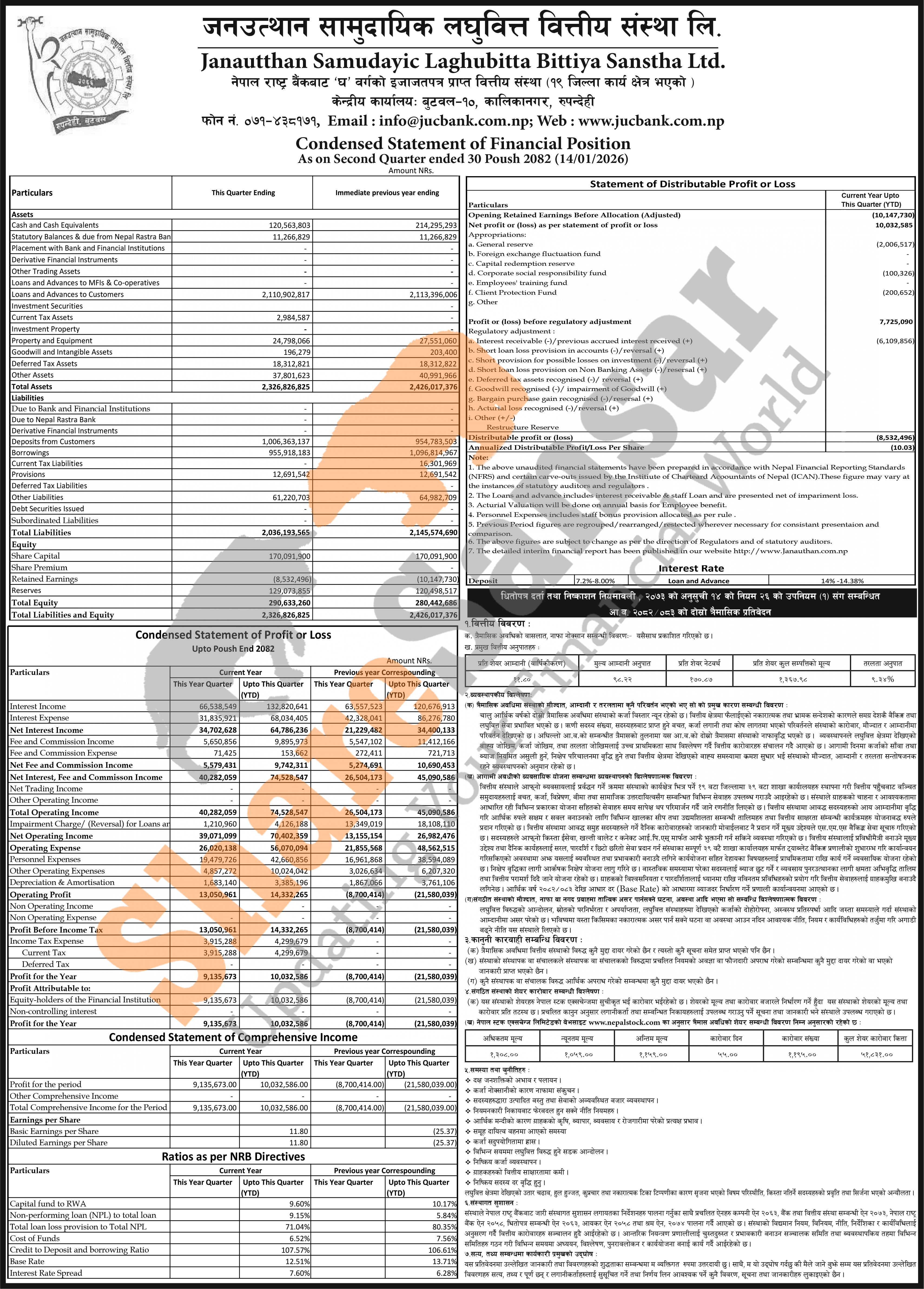 Janautthan Samudayic Laghubitta Bittiya Sanstha Limited has posted a net profit of Rs 10.03 million and published its 2nd quarter company analysis of the fiscal year 2082/83.