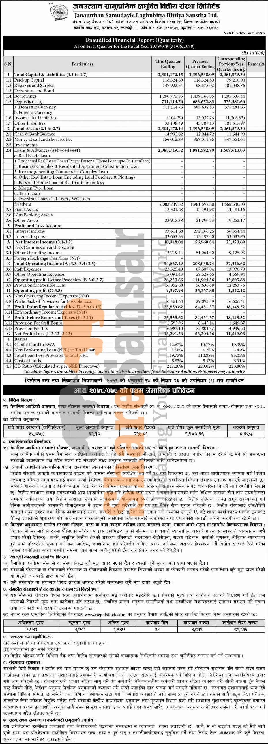 Janautthan Samudayik Laghubitta Bittiya Sanstha Limited has posted a net profit of Rs 16.29 million and published its 1st quarter company analysis of the fiscal year 2078/79.